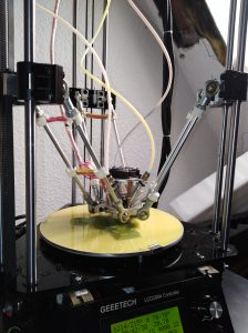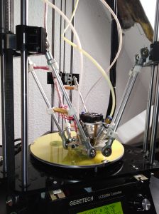 Es handelt sich dabei um einen Deltadrucker nach den Entwicklungen an einer Rostocker Uni „Delta Rostock/ Kossel“. Josef Prusa hat einst auch einen Kossel Delta an seinem Institut vorgestellt, weswegen ich es für eine gute Idee hielt, mir den Bausatz von Geeetech zu ordern. Meine 3D Druck-Kenntnisse waren jedoch vor 3 Jahren so beschränkt, dass ich mir weder unter dem Begriff Delta, noch Multifilament in Verbindung mit 3D Druckern irgendetwas vorstellen konnte.
