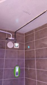 Nach der Lernstunde am PC bereitete ich auf einem Stück Kabelkanal mit einem Wasserdichten LED Lichtschlauch (ebenfalls steuerbare RGBled’s) ein Lichtschwert für die Decke. Mit Silikon habe ich sowohl innenlaufend, als auch links und rechts am Kabelkanal drei passende Streifen von meinem Lichtschlauch verklebt. Mit der Unterseite habe ich den LED Kabelkanal nun ebenfalls mit Silikon an die Decke geklebt. Natürlich habe ich bei der Herstellung gleich darauf geachtet, das an der Lampe benötigte Anschlusskabel zu verlöten und dieses auch mit Lack und Silikon wasserdicht verklebt. So ist die steuerbare Dampfduschendeckenlampe gleich komplett wasserdicht. Einen 30 cm Kabelkanal benötigte ich um auch das innenliegende Anschlusskabel von der Deckenlampe unsichtbar zu verstauen. Ein Loch war ja dank des ausgebauten Lautsprechers bereits da. Ich liebe es, wenn mein Plan funktioniert 😉 Damit der Kabelkanal nicht so aufällig wirkt, habe ich eine Blende für den Lautsprecher gedruckt; und das gleich zweimal. Dazwischen habe ich dann mit silikon aus den vorhandenen LED Resten ein Sandwich geklebt. So verschindet der hässliche Wandlautsprecher und lenkt vom Kabelkanal ab. Mal sehen was meine Frau sagt, wenn sie nachhause kommt.