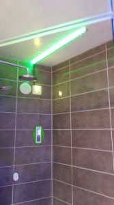 Ein 3 KW Dampferzeuger wurde von mir in die Zwischenwand (mit Wartungszugang vom Benachbarten Raum aus) eingebaut und neben dem Wasser auch an Abwasser angeschlossen. Das Prinzip ist das eines Wasserkochers, der über ein schickes Touchdisplay in der Dusche nun bedient werden kann. Sogar ein Radio und Blauzahn (koppeln mit Handy) ist mit an Board.